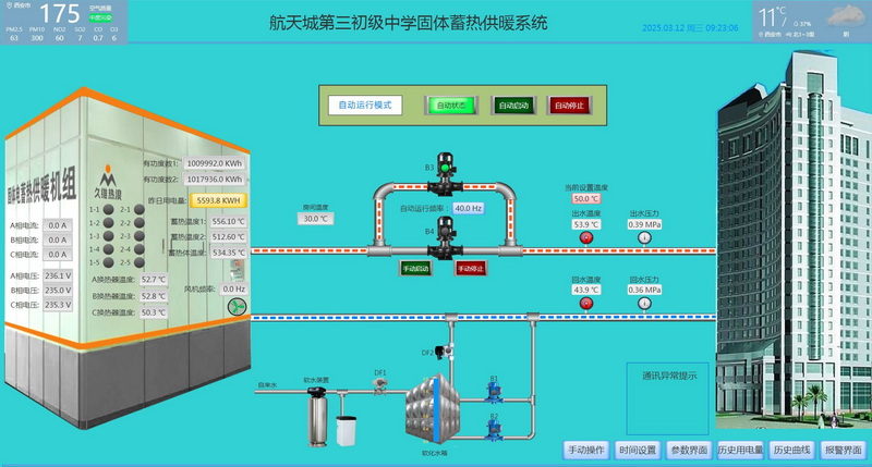 航天城第三初级中学清洁供暖项目,建筑面积3万多平方米,建成于2022年。该项目由我公司提供供暖服务,该项目采用固体蓄热供暖机组,固体蓄热供暖机组的最突出特点是供热效果强劲,利用波谷电价蓄热储能白天供暖时段放热,不占用企业白天的电容量资源。供暖机组带暖气片的能力超强,大约1000KW的机组占地不到50多平米,就能解决全校的供暖问题,包括教学楼、体育馆、大会堂、实验室、食堂、图书馆、学生宿舍等,机组运行过程没有噪音、无二氧化碳、二氧化硫、氮氧化物、灰渣、粉尘等污染物排放,真正实现清洁、环保,该技术比较适合于学校供暖。
