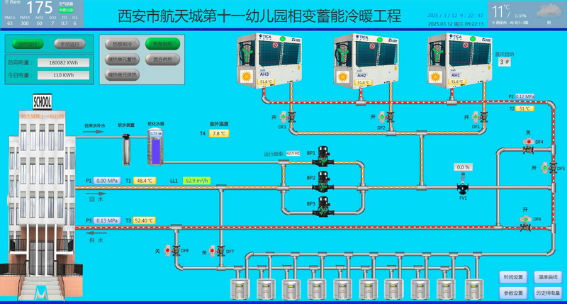西安市航天城第十一幼儿园供暖面积:5900平方米,这个项目由我公司提供供暖、供冷服务,这个项目采用热泵+相变储能供暖技术。幼儿园既要供暖还要制冷,而且对供暖和制冷要求较高,项目采用“相变蓄热单元”与热泵耦合的高效运行模式及解决了供暖,也解决了制冷。波谷电价时段以热泵为热源进行蓄热储能,能显著提升热泵效能节省能源,低碳环保。